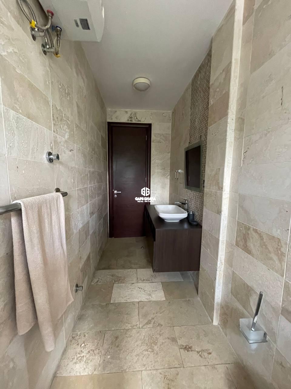 This space features all ensuite bedrooms, a guest washroom, a fitted kitchen, a closet, and a lovely balcony. For the perfect comfort and relaxation, the apartment is spacious and provides a serene atmosphere, offering 24-hour security and a water reservoir.
